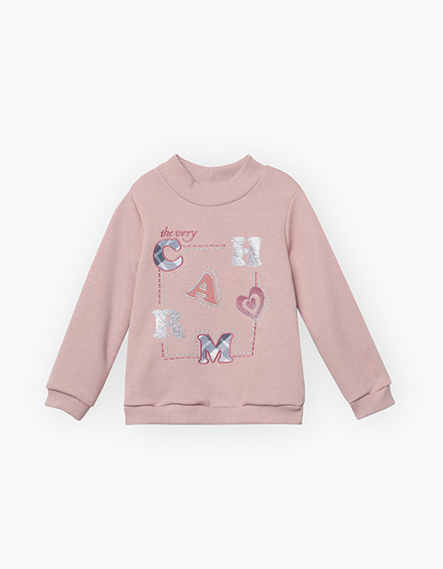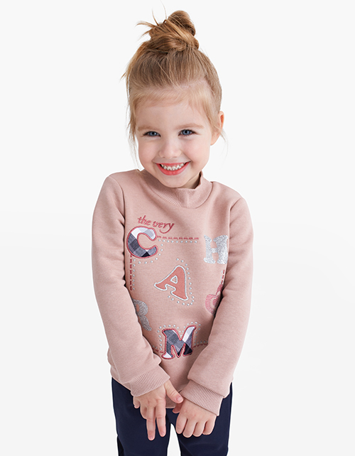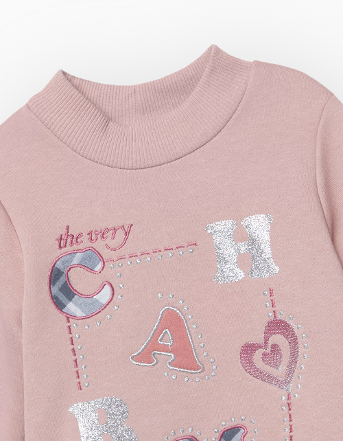 Комфортный пепельно-розовый свитшот свободного силуэта. С воротником-стойкой, манжетами и резинкой по нижнему краю из эластичной рибаны. Декорирован аппликацией из серебряной пленки и вышивкой серебряной нитью.