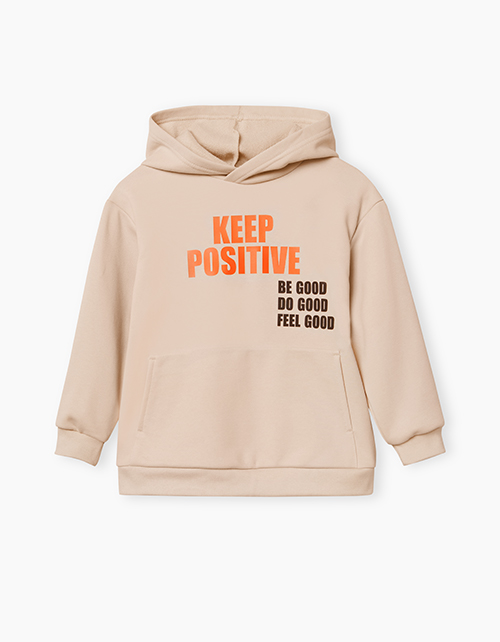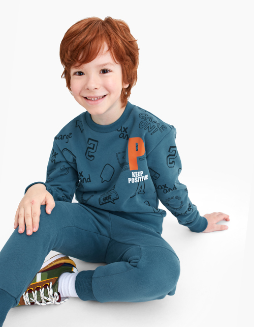 Удобный свитшот темно-бирюзового цвета с набивным текстовым принтом. Рукава, горловина и нижний край отделаны рибаной. Декорирован аппликацией и контрастным слоганом KEEP POSITIVE ("Оставайся позитивным").