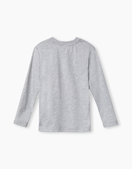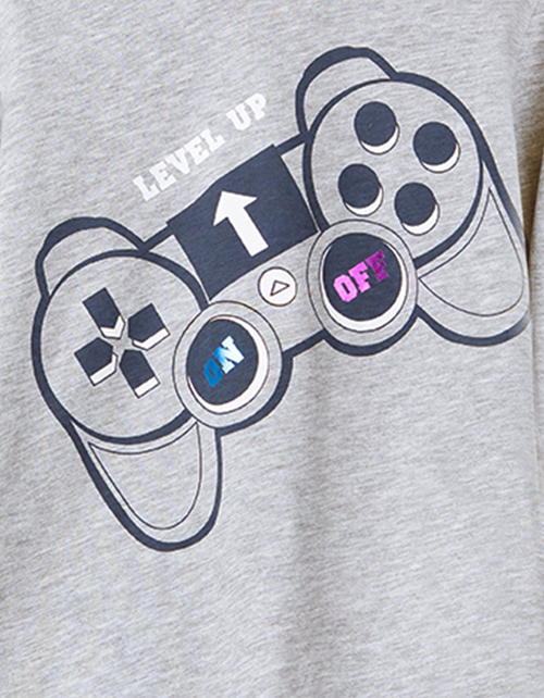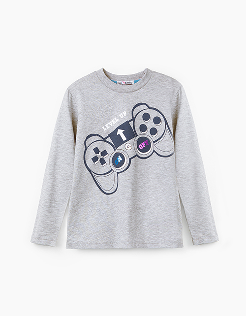 Трикотажный джемпер прямого силуэта с длинным рукавом для мальчика. Ткань - меланжевая кулирная гладь серого цвета. Крупный принт спереди с изображением игровой приставки и надписи Level up ("На уровень выше")