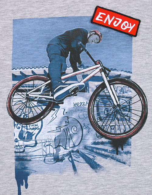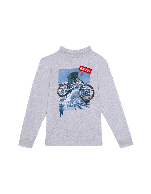 Джемпер для мальчика в цвете серый меланж дополнен высоким воротником, манжетами на рукавах и рисунком в виде велосипедиста. Трикотажная ткань кулирная гладь обеспечивает комфорт и гарантирует приятные тактильные ощущения.