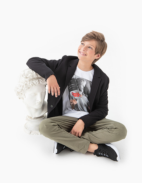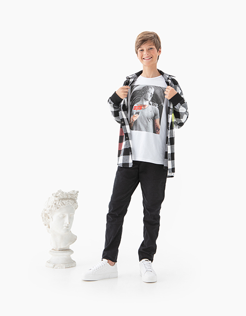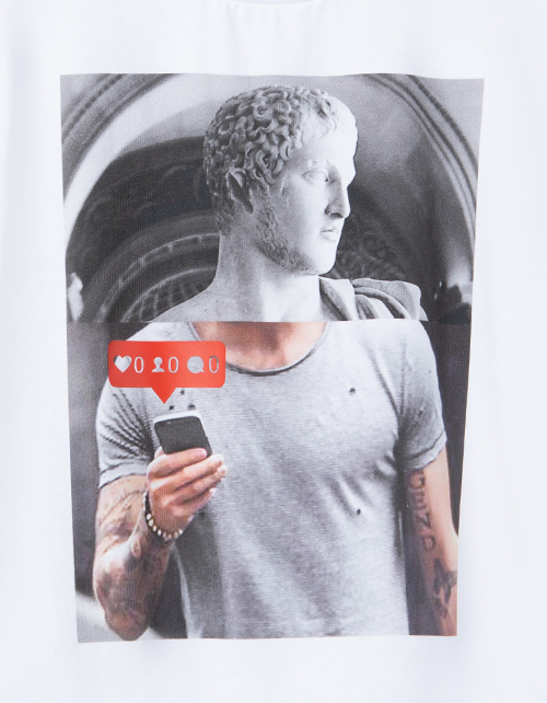 Белая футболка с принтом для мальчика-подростка. Выполнена из кулирной глади с эластаном. Декорирована изображением в стилистике фотоколлажа. Комбинируется с любой моделью коллекции "Ренессанс 21"