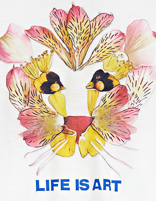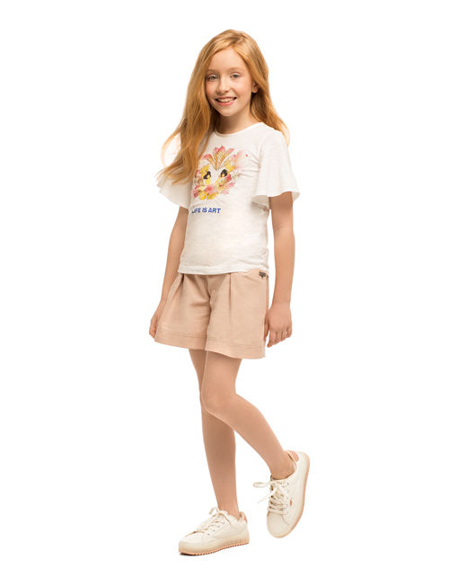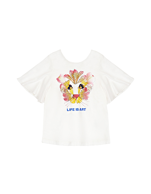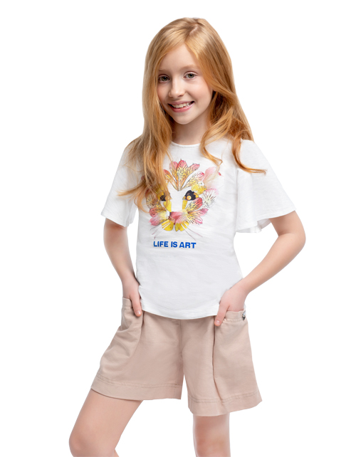 Повседневная белая футболка для девочки. Изделие дополнено трапециевидными рукавами и ярким принтом на лицевой стороне. Горловина круглая в передней части и v-образная на спинке.