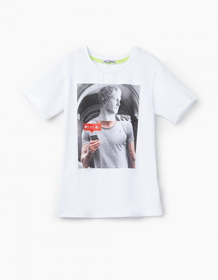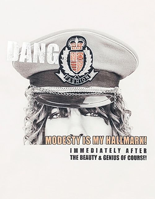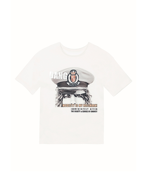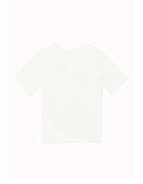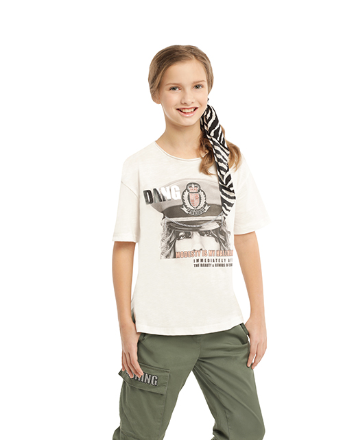 Молочная футболка для девочки с круглым вырезом горловины. Принт, вышивка и декоративные вставки в стилистике капсулы "Армия стиля".