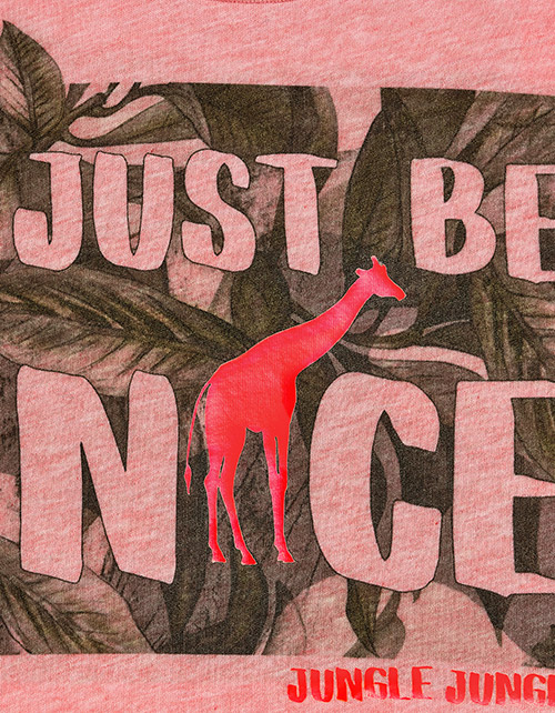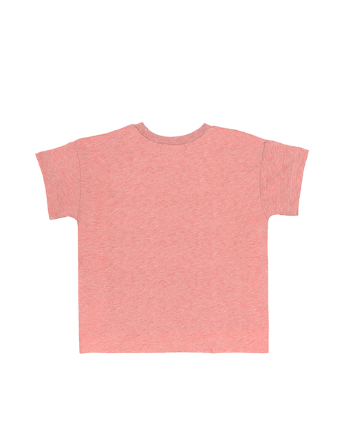 Футболка для мальчика цвета розовый меланж с удлиненной спинкой. Круглый вырез горловины. Принт в стилистике капсулы "Джунгли трип".