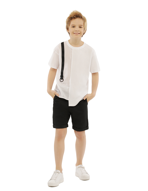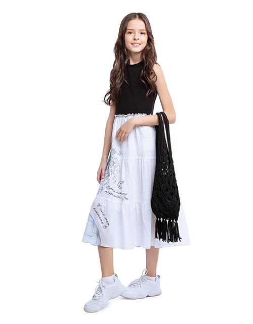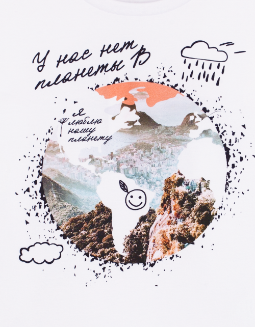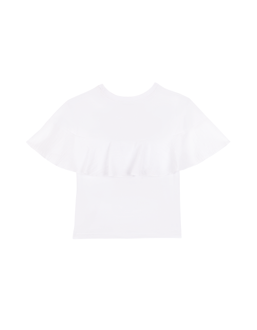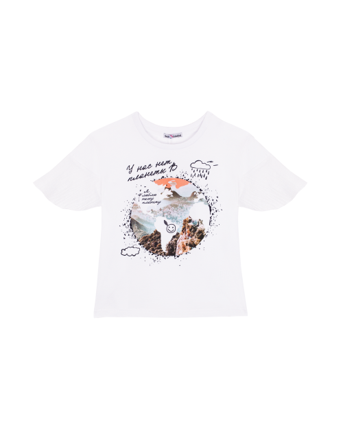 Повседневная белая футболка для девочки прямого силуэта. Короткие рукава и круглый вырез горловины. Футболка имеет отделку из плательной ткани и дополнена воланом на спинке и стильным принтом.