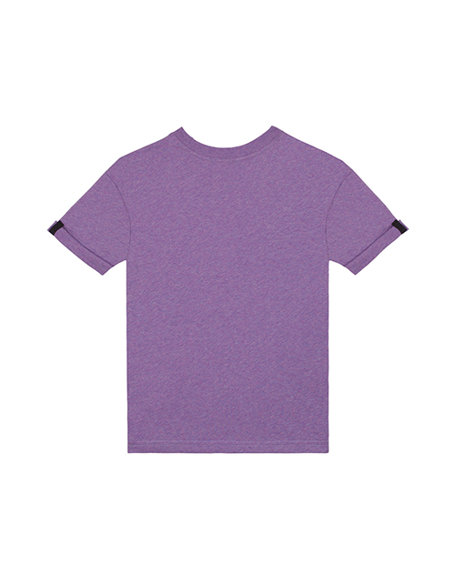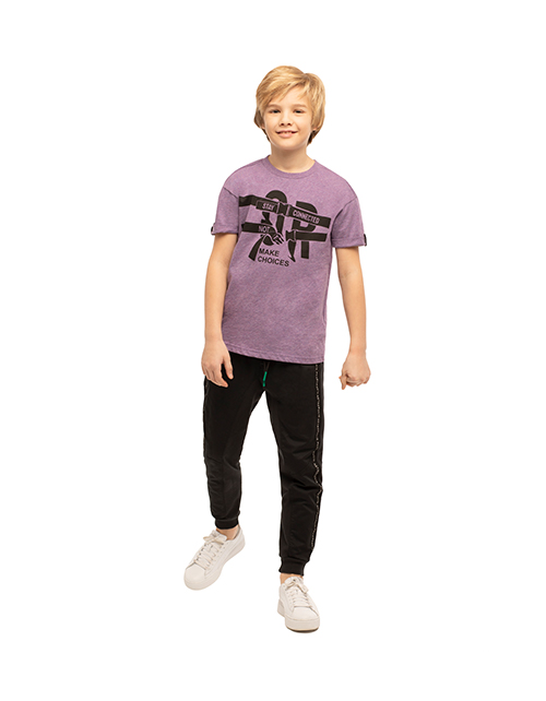 Футболка для мальчика цвета фиолетовый меланж с круглым вырезом горловины. Подвернутые рукава. Нашивка и принт в стилистике капсулы "Мегаполис".