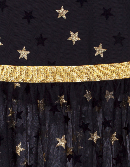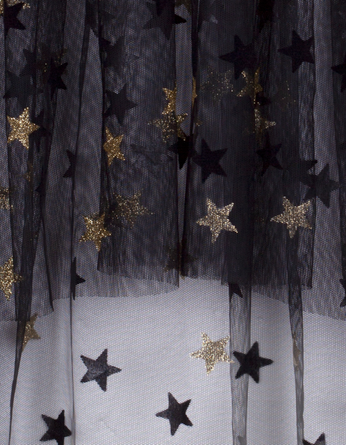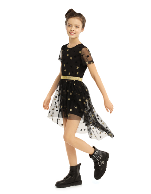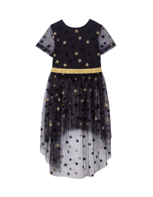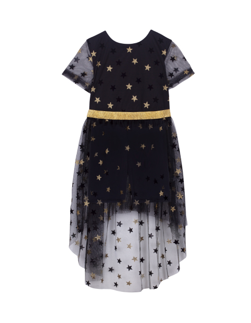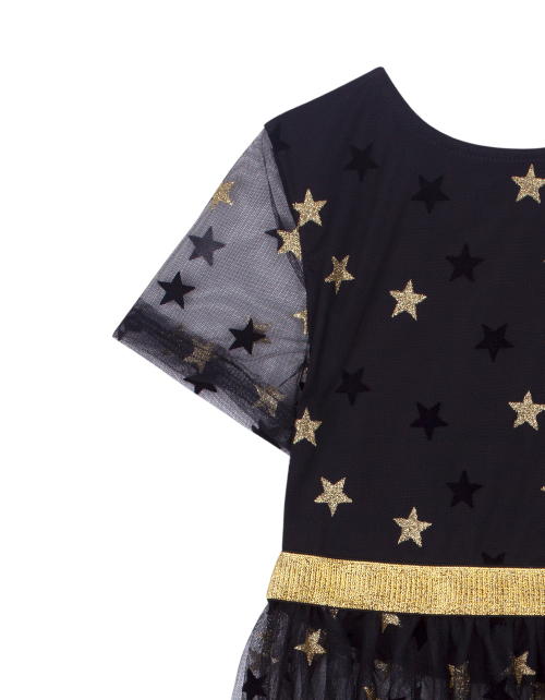 Нарядный комплект включает в себя платье для девочки и шорты. Платье с коротким рукавом и круглым вырезом горловины имеет отделку сетчатым полотном со звездами с блестками. Застежка на пуговице на спинке. Шорты на резинке.