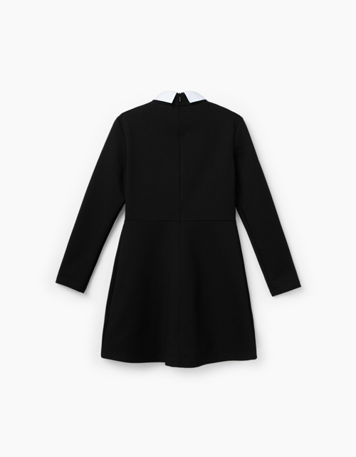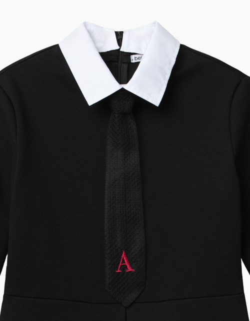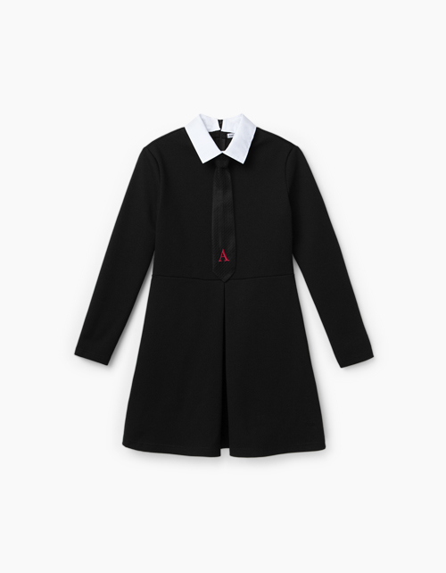 Школьное приталенное платье из черного трикотажа. Отрезная юбка со встречной складкой спереди, стояче-отложной воротник из белой сорочечной ткани, прямой рукав, застёжка на молнию сзади. Съемный галстук декорирован ажурной сеткой