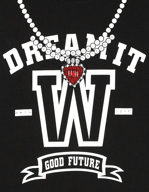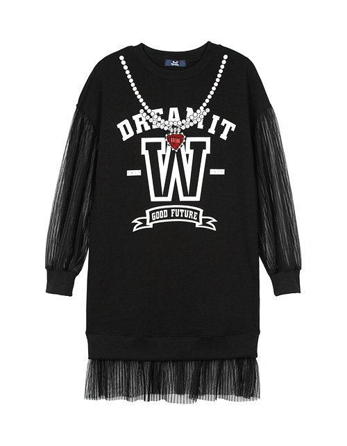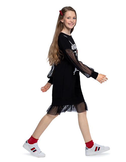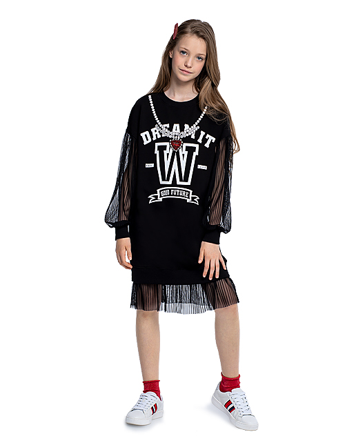 Платье для девочки прямого силуэта с круглым вырезом горловины и манжетами на рукавах дополнено принтом в виде надписей и имитацией подвески на груди. Рукава и низ изделия имеют отделку сетчатой тканью с пайетками. Ткань футер гарантирует комфорт в носке.