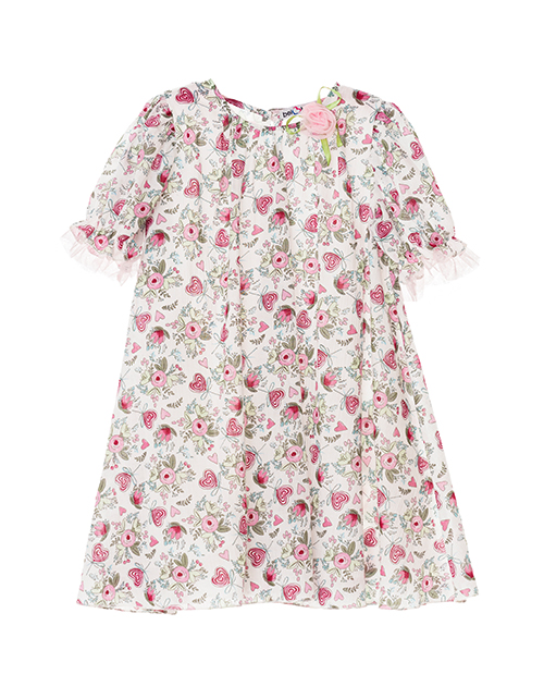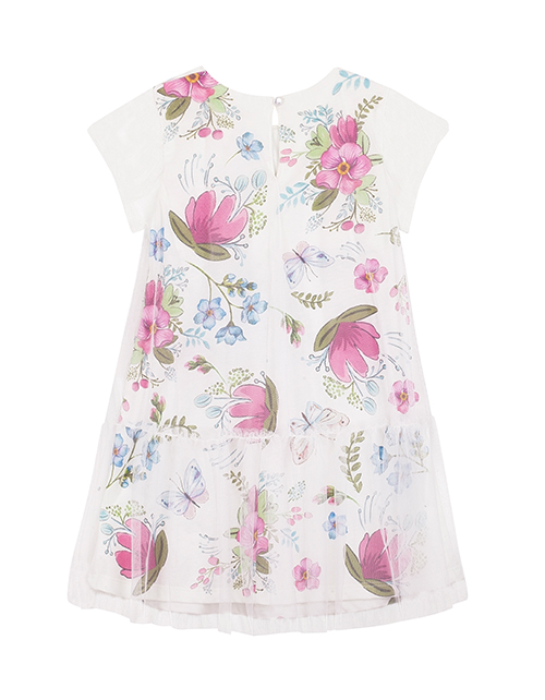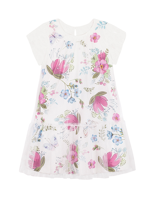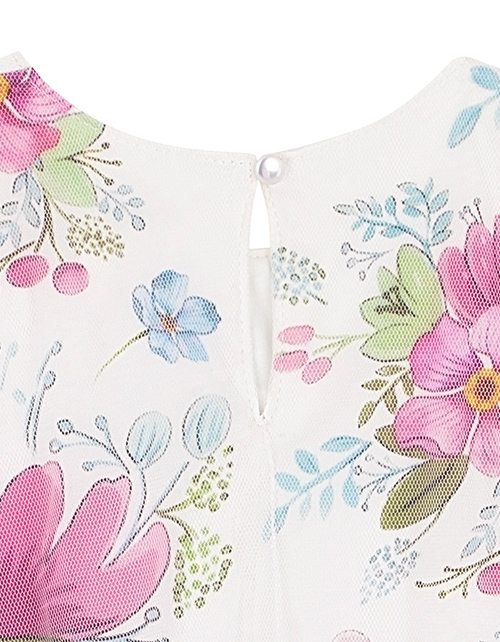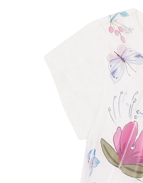 Белое платье для девочки в дизайнерском оформлении "Незабудка". Круглое горло и короткие рукава. Застежка на пуговице. Декоративное сетчатое полотно, украшенное стразами.