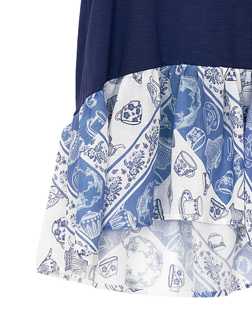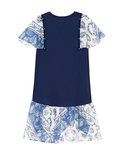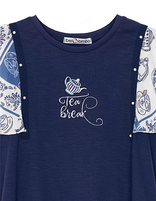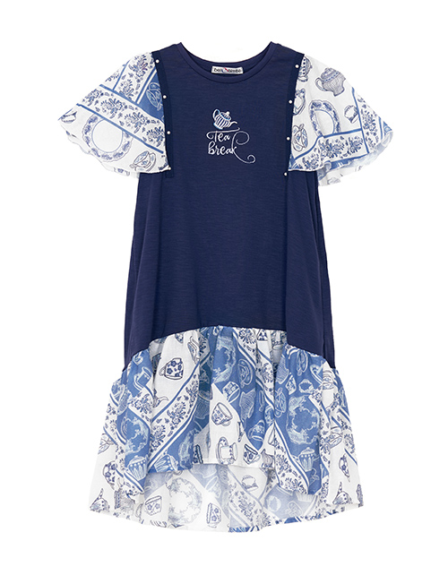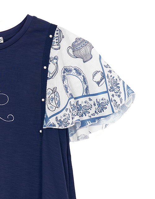 Платье для девочки цвета деним. Короткий рукав и юбка с оборками и оформлением в стилистике капсулы "Чаепитие в саду". Стразы по контуру рукава.