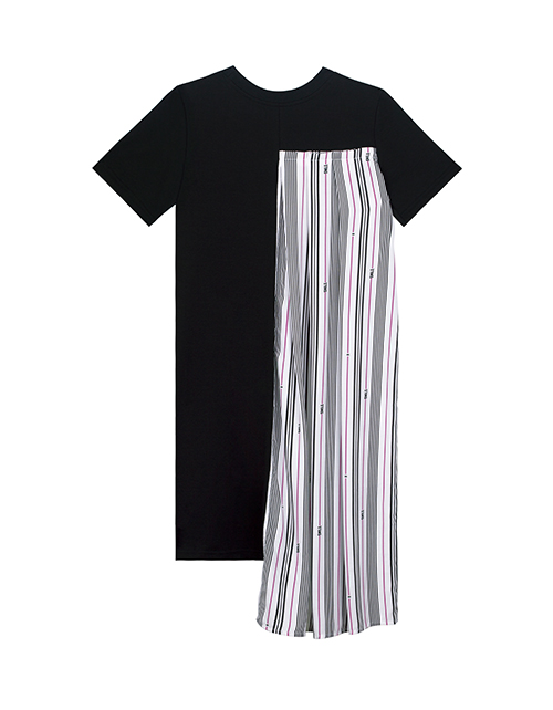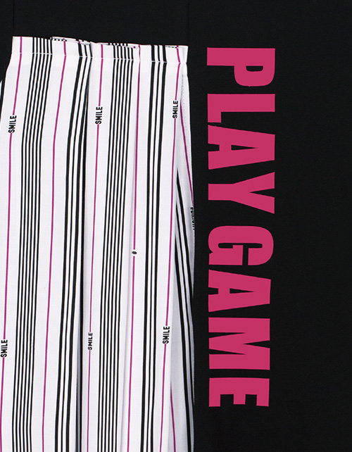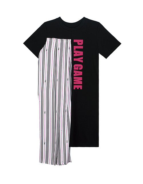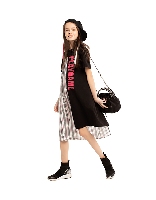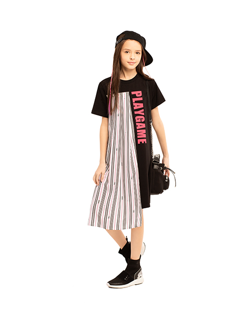Черное платье для девочки с коротким рукавом и круглым вырезом горловины. Принт-надпись в стилистике капсулы "На своей волне". Вставка из белой плательной ткани в полоску.