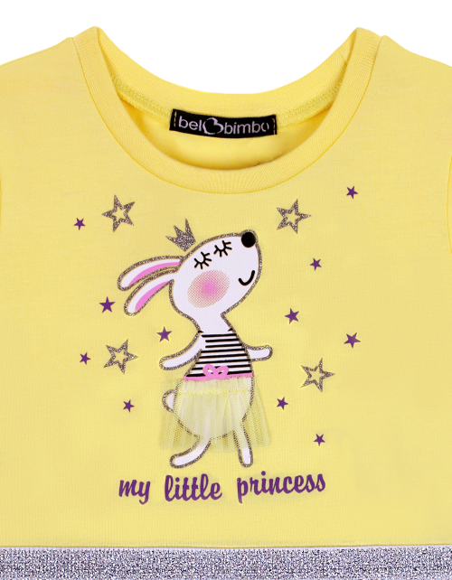 Светло-желтое платье для девочки трапециевидного силуэта. Короткий рукав и круглый вырез горловины. Юбка и рукава из сетчатого полотна со сборками. Верх и низ изделия соединены мягкой люрексовой лентой. Дизайнерское оформление в стилистике капсулы "Event