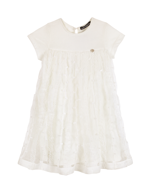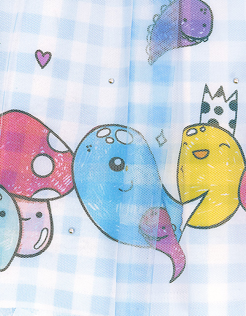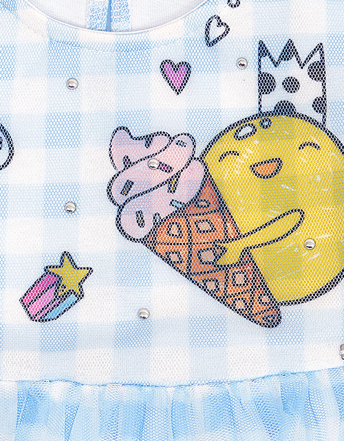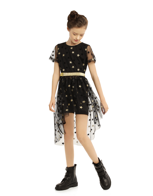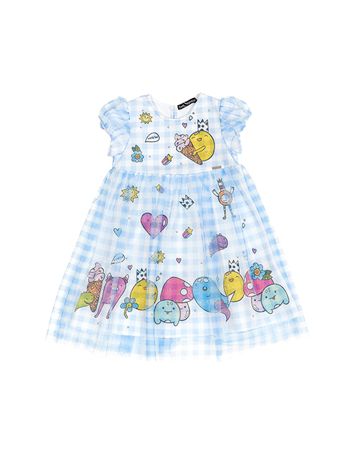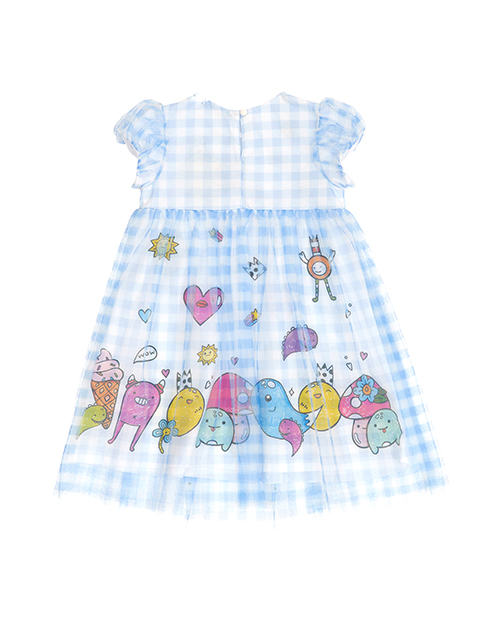 Нарядное платье А-силуэта из ткани кулирная гладь. Завышенная линия талии и круглый вырез горловины. Рукава-фонарики и застежка на пуговицу на задней части изделия. Платье дополнено ярким принтом, юбка декорирована сетчатым полотном.