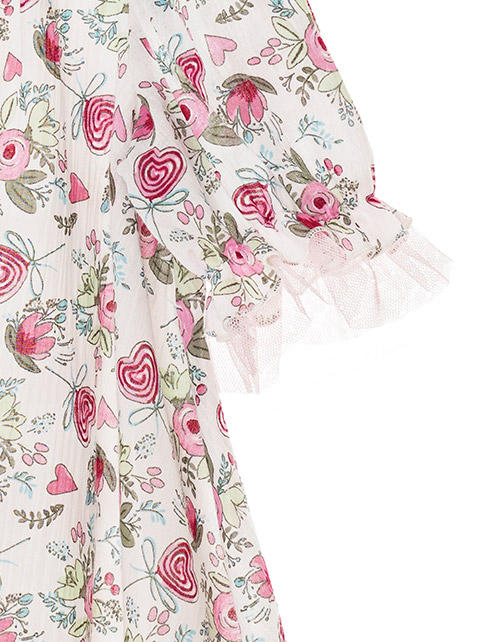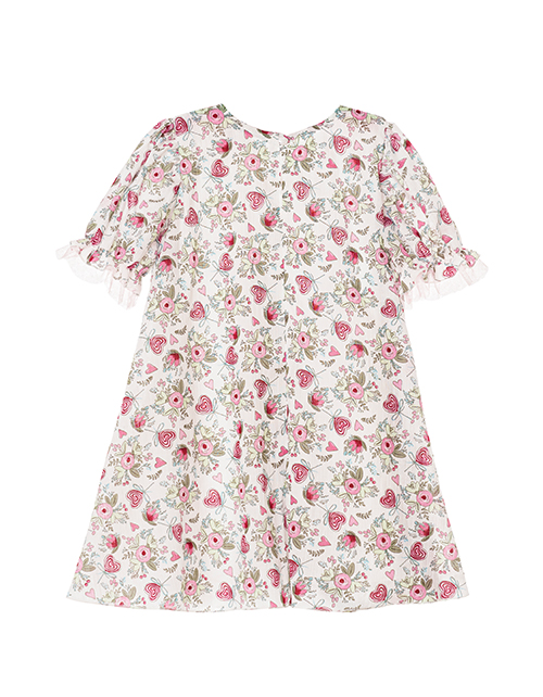 Набивное платье для девочки трапециевидного силуэта. Удлиненное, свободный крой. Рукав-фонарик с оборками. Застежка на спинке на пуговицу. Дизайнерское оформление в стилистике капсулы "Незабудка".