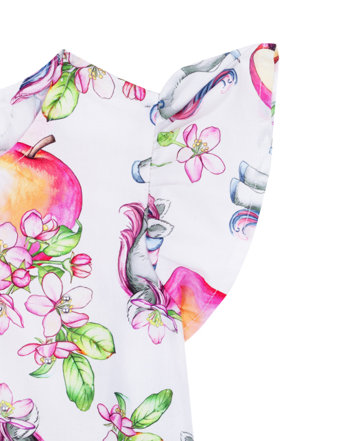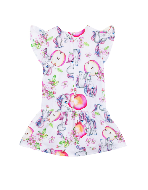 Повседневное платье для девочки а-силуэта с заниженной линией талии. Круглый вырез горловины и короткие рукава крылышками. Дизайнерская композиция дополнена стильным принтом и контрастным кантом с надписями.