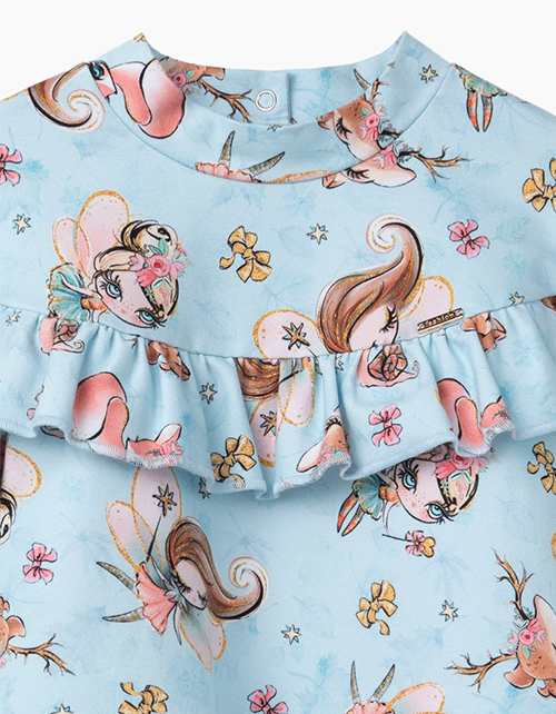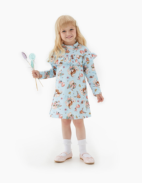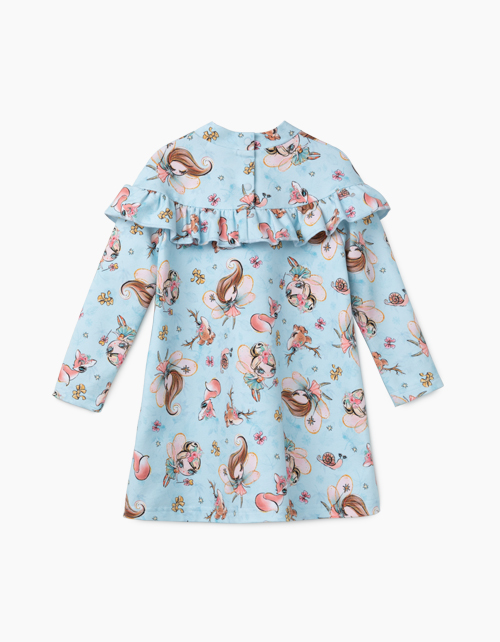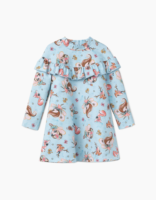 Платье А-образного силуэта из футера с набивным рисунком. Длинный рукав. Декоративная оборка по линии плечевого пояса спереди и сзади. Удобная застежка-книппер.