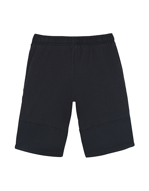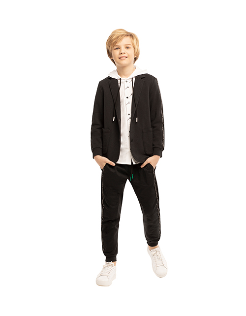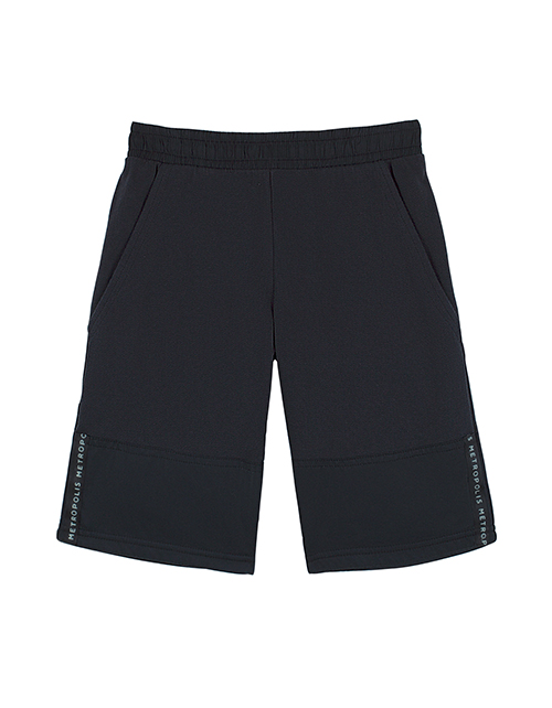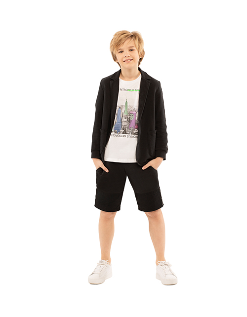 Черные шорты для мальчика с карманами. Мягкий пояс со шнурком. Лампасы из киперной тесьмы. Оформление в стилистике капсулы "Мегаполис".