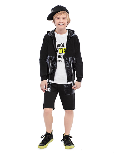Черные шорты для мальчика на резинке. Карманы и лампасы. Дизайнерское оформление в стилистике капсулы "Уличный движ".
