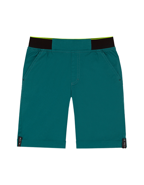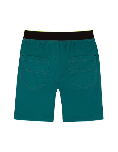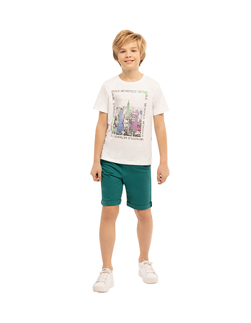 Шорты для мальчика цвета изумруд. Прямой силуэт с отворотами по низу. Пояс на резинке контрастного цвета, сзади изделие два накладных кармана. Оформление в стилистике капсулы "Мегаполис".