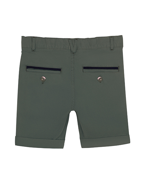 Шорты для мальчика цвета хаки. Передние и задние накладные карманы. Отвороты по низу изделия. Шлёвки по поясу.