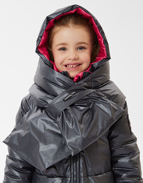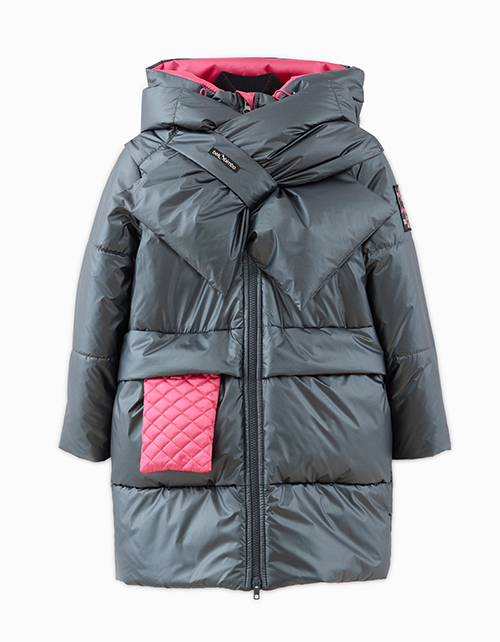 Стильная зимняя куртка с модным аксессуаром - лимитированным шарфом. Модель с акцентным элементом в виде отстегивающейся сумочки и накладными карманами. Куртка выполнена из функциональной и простой в уходе ткани с модной фактурой "эко-кожи".