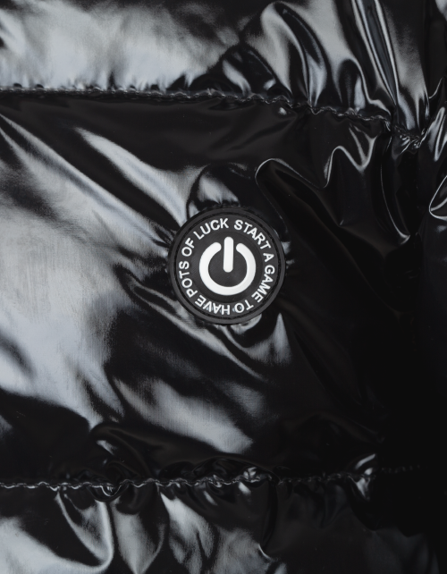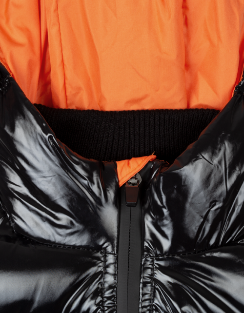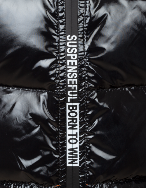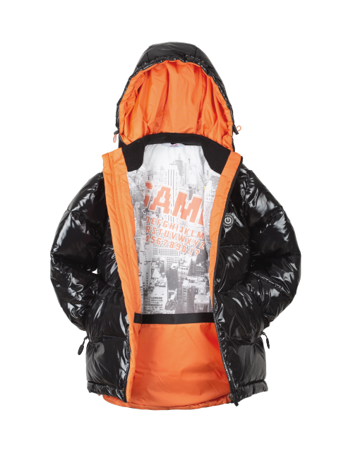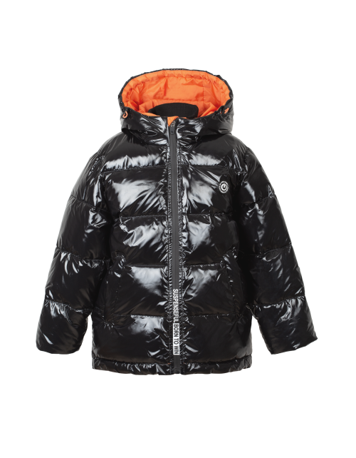 Куртка для мальчика на синтепухе прямого силуэта дополнена капюшоном с высоким воротником, манжетами на рукавах, застежкой молнией и небольшой нашивкой на груди. Ткань плащевая таффета с виниловым покрытием не пропускает влагу и имеет характерный блеск.
