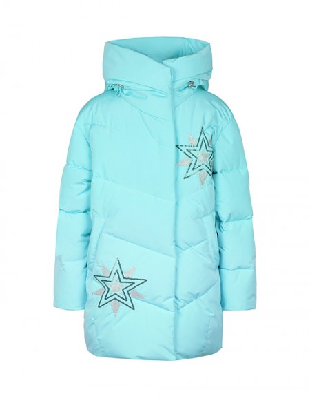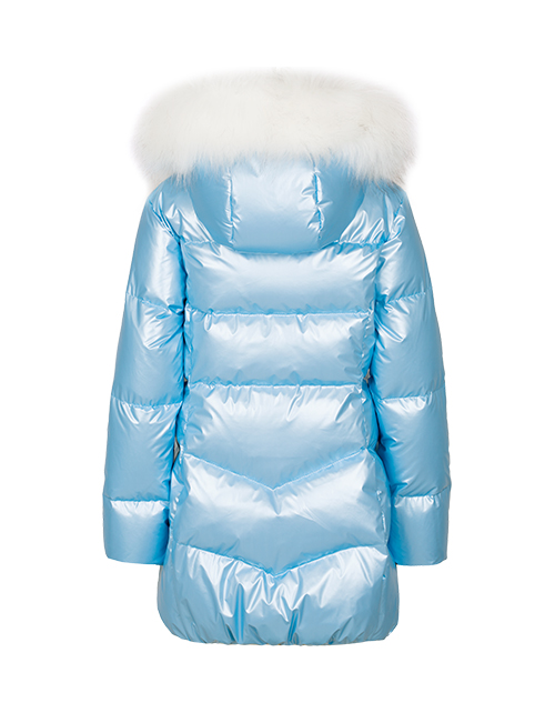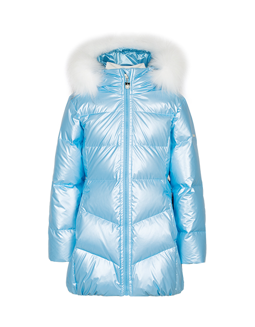 Куртка для девочки на пуху приталенного силуэта дополнена застежкой молнией, капюшоном с мехом и высоким воротником. Ткань плащевая дьюспо с жемчужным покрытием не пропускает влагу, а подкладка из флиса и нейлона гарантирует комфорт в носке.