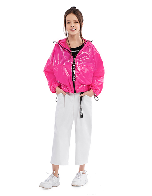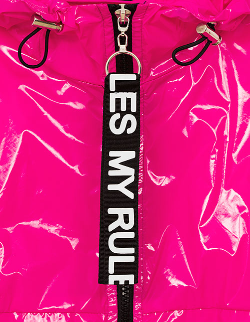 Розовая ветровка для девочки свободной укороченной формы со спущенным плечом. Центральная застежка на контрастную молнию. Капюшон, манжеты и низ изделия на регулировке. Карман декорирован фирменной нашивкой.