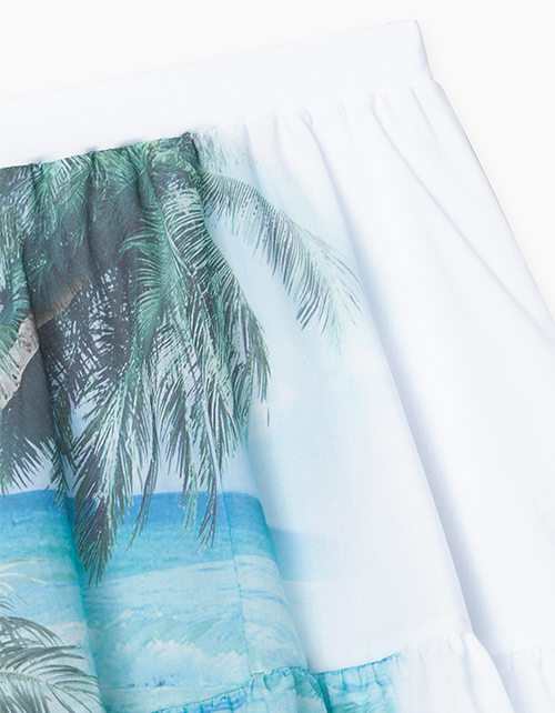 Легкая юбка для девочки-подростка, присборенная по линии талии, с притачным воланом. Выполнена из белого муслина с набивным принтом в виде морского пейзажа и надписью Create your mood ("Создай свое настроение"). На удобном эластичном поясе из рибаны