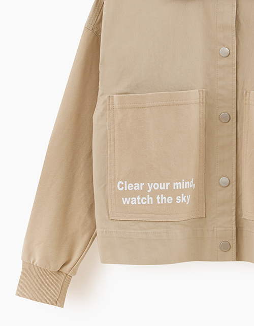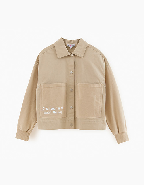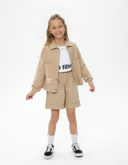 Бежевый жакет на кнопках для девочки. Укороченная модель, прямого расслабленного силуэта со спущенной линий плеча. Акцентный дизайн на спинке и накладные карманы. Хорошая альтернатива джинсовке