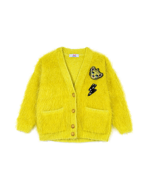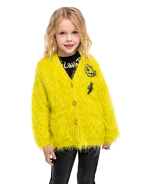 Жакет для девочки из пряжи с длинным ворсом свободного силуэта имеет застежку на пуговицах, два накладных кармана и нашивки в виде тигренка и молнии. Приятная к телу пряжа и свободный стиль изделия гарантируют комфорт в носке.