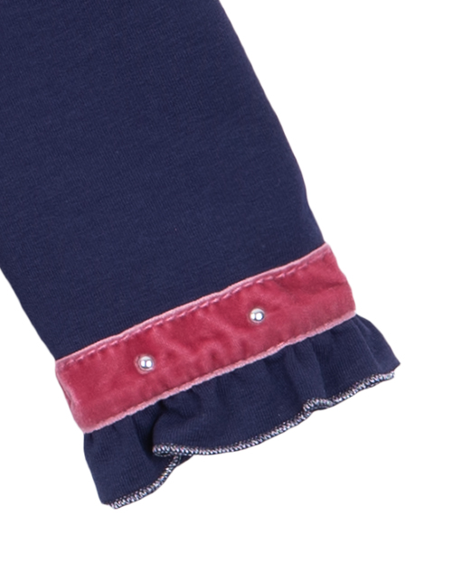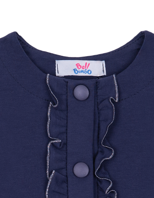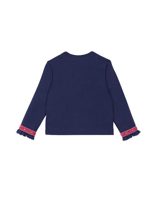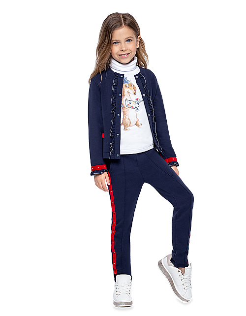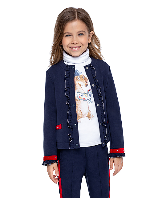 Жакет для девочки свободного силуэта дополнен застежкой на пуговицах, контрастной отделкой и оборками на рукавах и планке. Изделие имеет длинный рукав и круглый вырез горловины. Ткань футер дарит комфорт в носке.