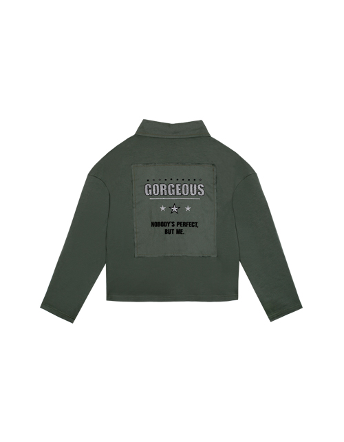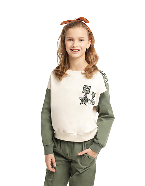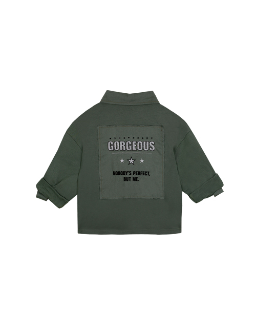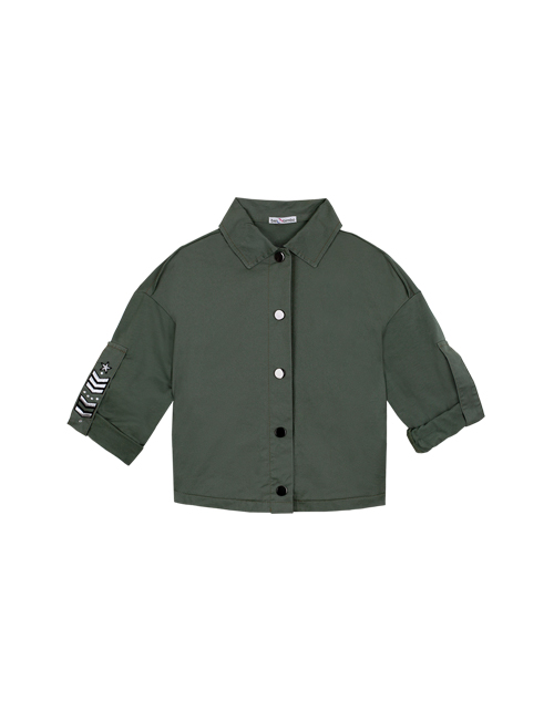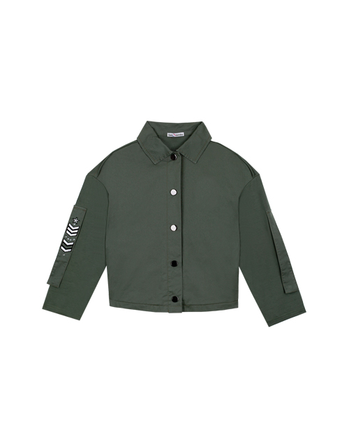 Жакет для девочки цвета хаки. Застежка конструкции турникетная кнопка. Нашивки и стразы в стилистике капсулы "Армия стиля". Воротник типа "Акулий плавник".
