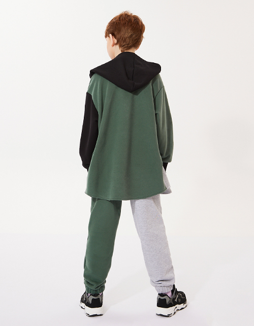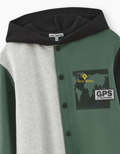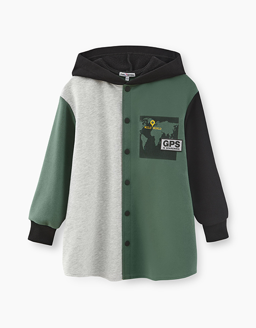 Трендовый жакет-рубашка в стиле колор-блок для мальчика. Комфортная модель с капюшоном из футера и застежкой на кнопки. Жакет декорирован нашивкой и принтом. Модель выполнена из футера с браш-эффектом, что делает жакет мягким и бархатистым, повышая износо