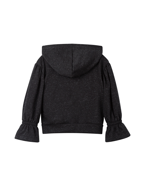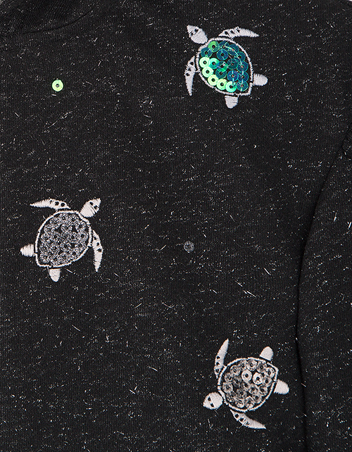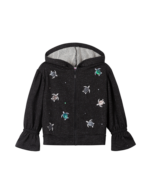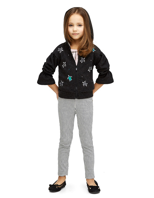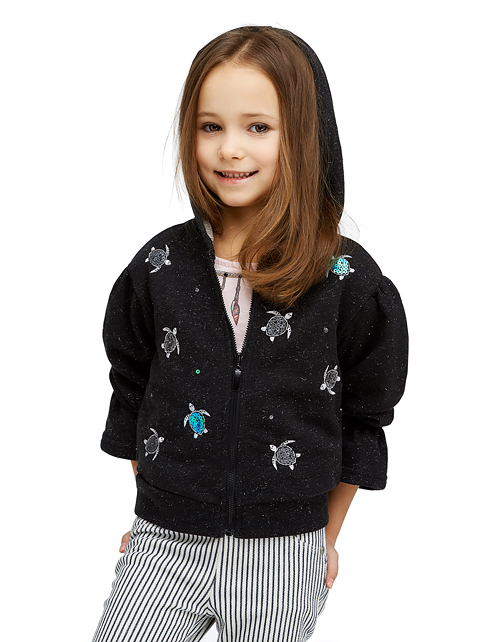 Мягкий жакет из мерцающей ткани подчеркнёт уникальность Вашей девочки. Оверсайз силуэт, капюшон, игривые рюши на рукавах и декор с черепашками, пайетками и стразами создают комфортный и незабываемый образ